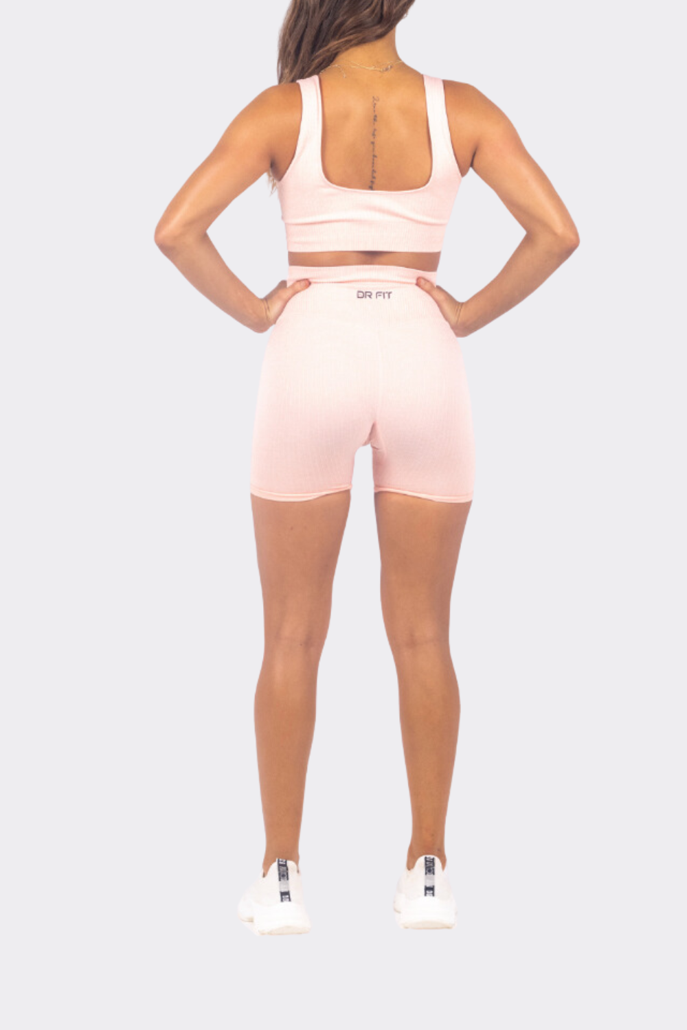 Bella is 5'5" and wears a size SMALL in the Ribbed Pink 7/8 Leggings